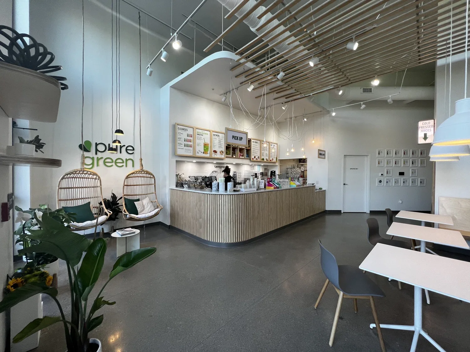 The Pure Green interior design creates a bright, wellness-focused environment through the use of natural wood slats and organic textures. The space features unique lifestyle elements, such as hanging wicker chairs and lush indoor greenery, balanced by a clean, modern service counter and minimalist seating for a refreshing customer experience.